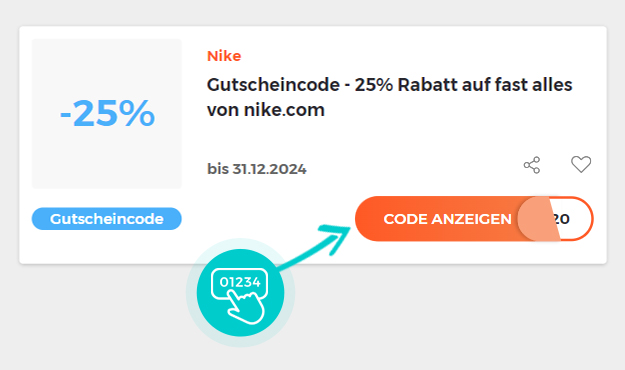 Wählen Sie auf unserer Webseite einen konkreten Gutscheincode, den Sie bei nike.com einlösen möchten und klicken Sie das orange Feld „Code anzeigen“ an.
