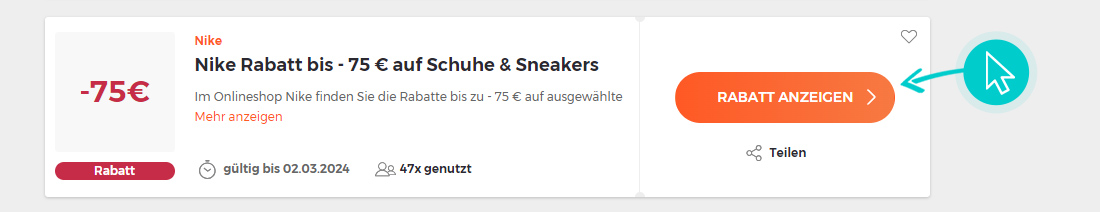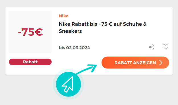 Wählen Sie auf unserer Webseite einen konkreten Rabatt und klicken Sie das Feld „Rabatt anzeigen“ an, um automatisch direkt zum Sonderangebot im Onlineshop nike.com, wo Sie das von Ihnen gewählte Produkt mit dem Rabatt kaufen können, weitergeleitet zu werden.