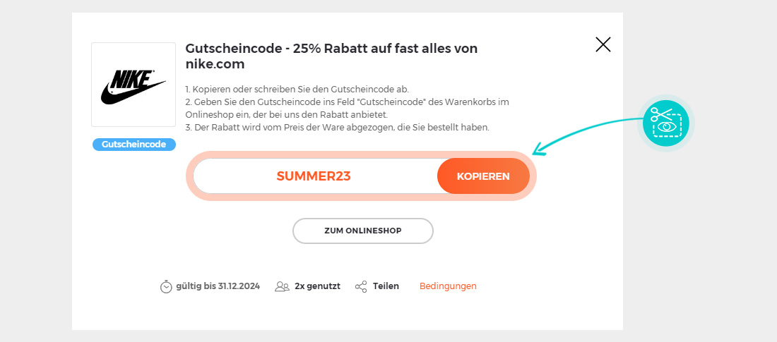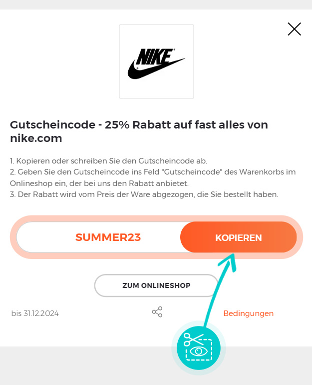 Kopieren Sie den Gutscheincode oder schreiben Sie ihn ab und klicken Sie das Feld „Zum Onlineshop“. Danach werden Sie direkt zu nike.com weitergeleitet.